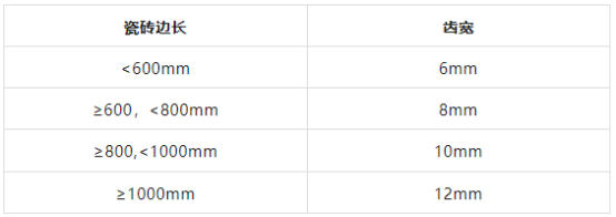 “薄貼法”貼磚,必須用齒型刮刀在瓷磚與基面將瓷磚膠刮出紋路后再進(jìn)行鋪貼,齒型刮刀種類很多,寬度不一,而齒縫并不是越寬粘性越好,要怎么選,可以參考下面表格。